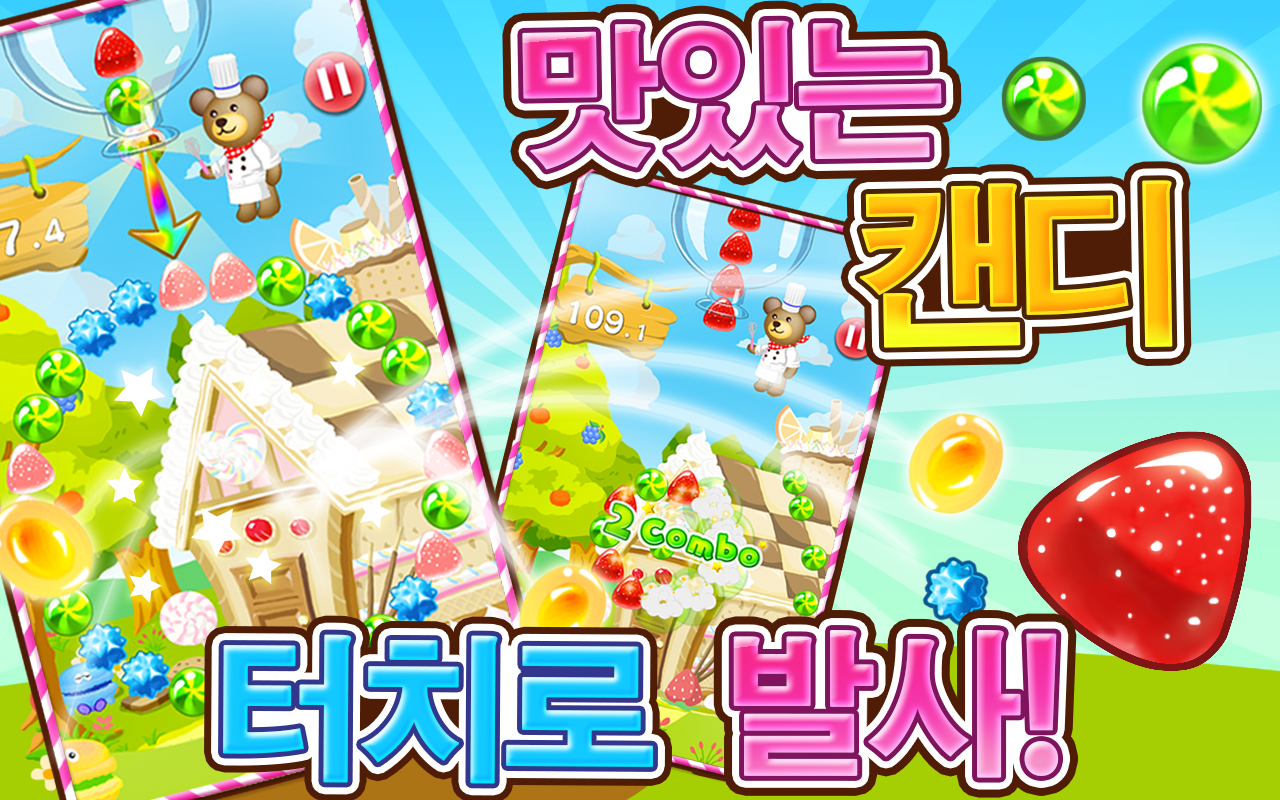 화면을 살짝 눌러 같은 모양의 캔디를 3개씩 모아주세요.