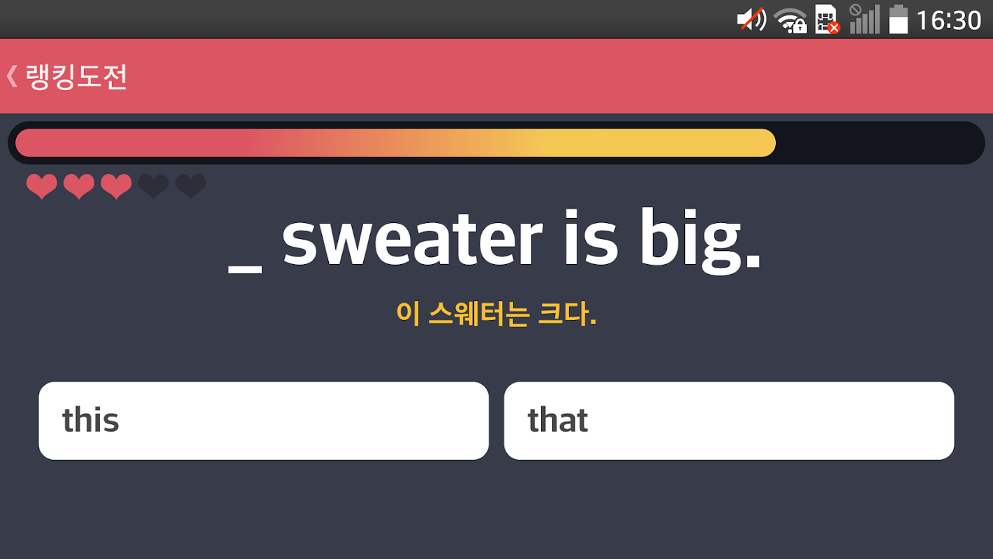 - 뜻 맞추기, 문장 배열하기, 단어 빈칸채우기, 문법 맞추기 퀴즈를 통해서 랭킹도전을 할 수 있습니다.