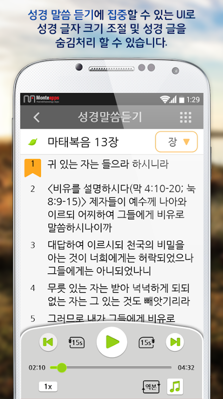 (배경음악 on/off 기능은 개역개정에만 해당됩니다. 개역한글은 배경음악이 있는 음원만 지원됩니다.)