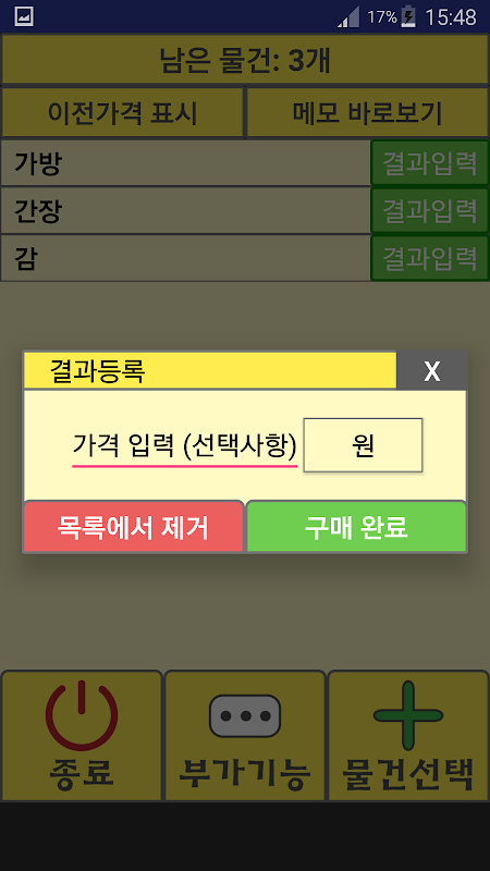 2. 결과입력: 물건 선택이 완료되면 남은 물건의 수와 종류가 표시됩니다. 결과입력 버튼을 누르면 구매결과를 입력 할 수 있습니다. 가격을 입력하면 다음부터 해당 물품의 이전가격 조회가 가능합니다. 전에 얼마 주고 샀는지 잘 기억이 나지 않을 때 유용합니다. 구매내역은 부가기능에서 조회가 가능합니다.