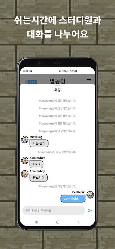 그렇지만! 그럴 때마다 다른 독서실 친구들이 당신의 아바타를 깨우기 위해 알림을 보내 다시 공부방으로 들어오라고 재촉할거예요.