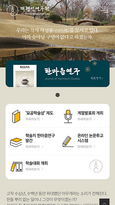 많은 사람에게 대행선사의 가르침과 생애를 체계적으로 조명하고 폭넓게 알리며, 또한 마음의 원리와 작용을 쉽게 이해하여 실천 할 수 있도록 널리 보급하기 위해, 우리 연구원에서, 온라인 법석을 열게 되었습니다. 이 홈페이지를 통해 자성불 지혜를 증득하는 인연 맺게 되기를 바랍니다.