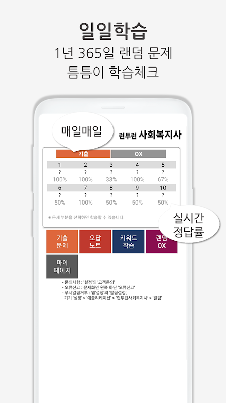 - 하루 랜덤으로 소량의 문제를 풀며 취약 부분을 확인하고 하단 버튼으로 보완할 수 있습니다.