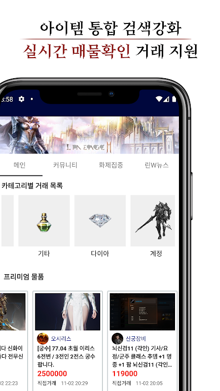 모바일 기반 실시간 채팅, 아이템 매물검색, 최신 소식 정보 등 리니지W 아이템 거래 및 다양한 기능을 체험해보세요.