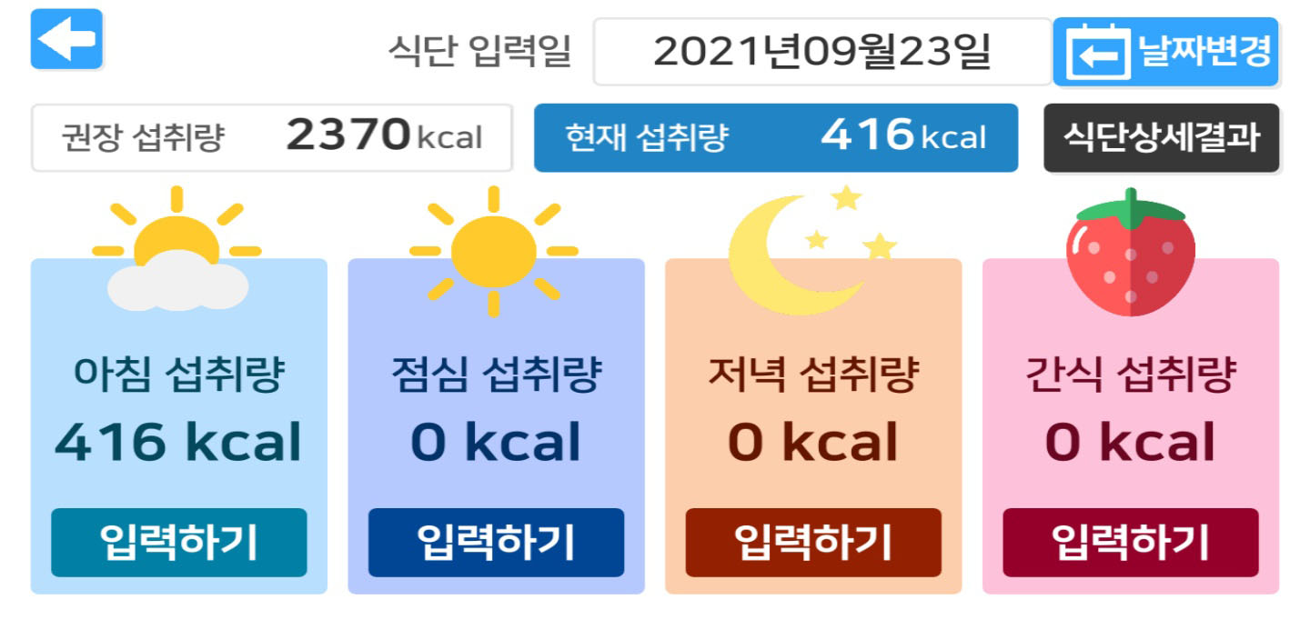 * 본인이 입력한 전체 데이터 확인 가능 - 비만도(BMI), 5대 영양소(열량, 탄수화물, 단백질, 지방, 나트륨), 운동, 만보기