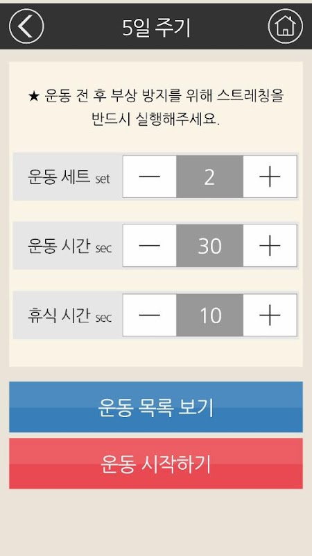 - 운동 리스트 - 운동에 대한 자세한 설명과 주의사항을 운동 영상과 함께 제공합니다. 그리고 하고 싶은 운동을 선택하여 운동할수도 있습니다.
