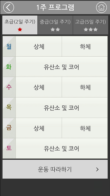 - 초급, 중급, 고급 3단계로 요일별 운동을 제시