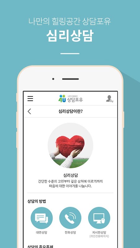 * 모바일 상담포유는 안드로이드 2.3.3, ios 7.0 이상 버전부터 지원 가능합니다.