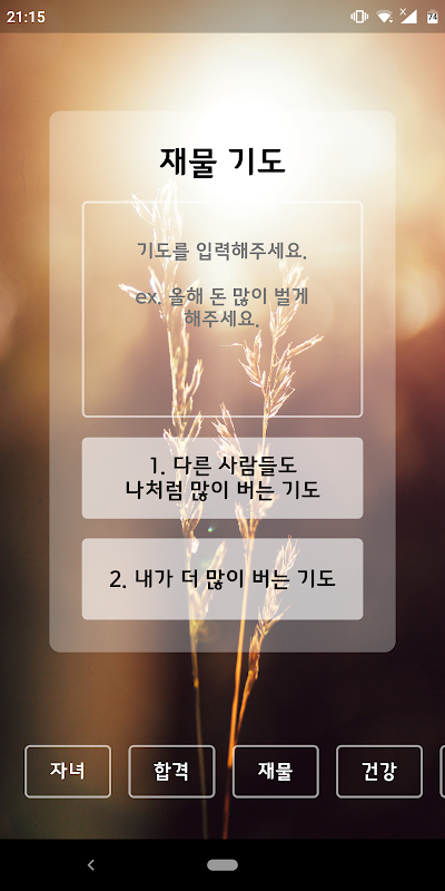 자녀 기도, 합격 기도, 재물 기도, 건강 기도, 승진 기도, 사업 기도, 배우자 기도, 부동산 기도가 준비되어 있습니다.