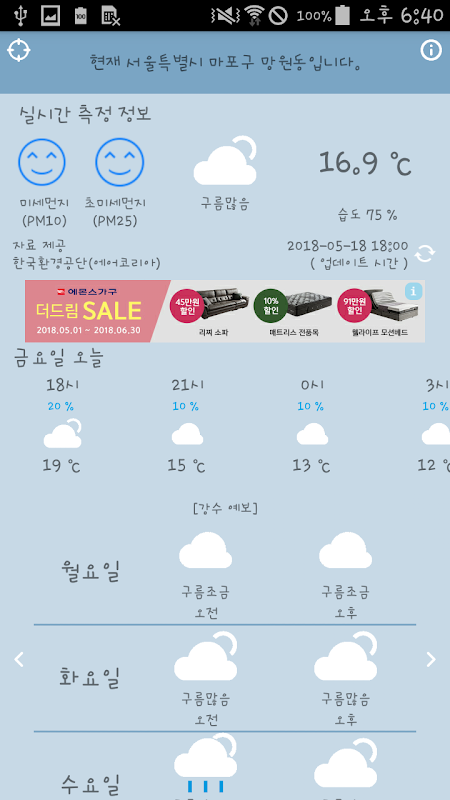현재 지역의 기온, 습도, 구름, 강수량, 미세먼지 정보를 기상청에서 제공받아 쉽게 보여주는 어플리케이션입니다.