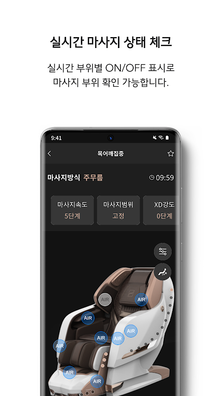 Вы можете проверить статус массажного кресла в режиме реального времени с помощью интуитивно понятной и удобной конфигурации пользовательского интерфейса.Измените статус массажного кресла, например, интенсивность массажа и местоположение, удобно на мобильном устройстве.