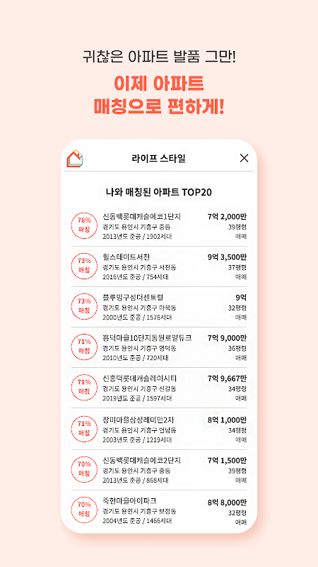 Мы собираем более 100 миллионов данных в режиме реального времени, включая удобство местности, внутреннюю среду, сложную среду, рыночную цену, историю транзакций и темпы роста рыночных цен, чтобы подобрать квартиры, оптимизированные для вашего образа жизни.