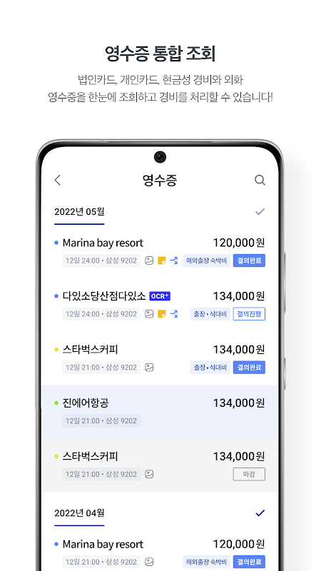 Автоматически собранные квитанции по корпоративным картам и другие простые (наличные) квитанции, квитанции по личным картам, собранные с ПК, квитанции по картам T-money и квитанции с нулевой оплатой! Теперь легко управляйте своими расходами с помощью Bizplay Mobile!