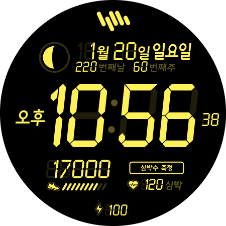 В WatchFace есть батарея, счетчик шагов и пульсометр.