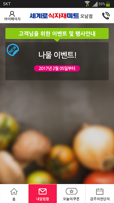 세계로식자재마트 오남점이용 고객을 위한 모바일 어플리케이션입니다.본 앱을 통해 세일정보 확인 등 다양한 서비스를 이용할 수 있습니다.