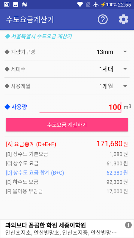 서울특별시 지역에서 사용할 수 있는 수도요금계산기 입니다.