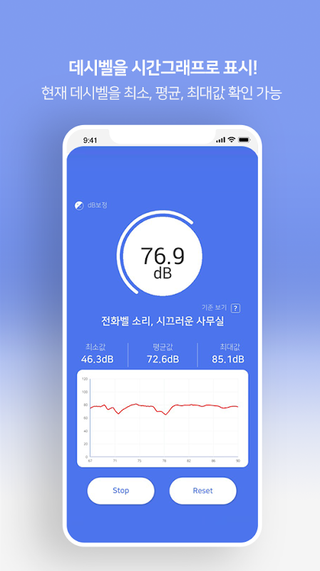 ✔ 현재 데시벨을 기준으로 최소, 최대, 평균 데시벨 확인 가능!