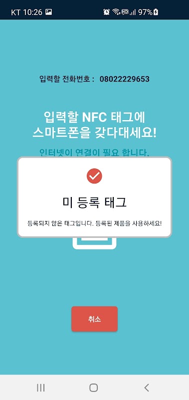셋째: 옥색 화면이 나오면 NFC 태그 스티커에 스마트폰 뒷면을 갖다 댑니다.