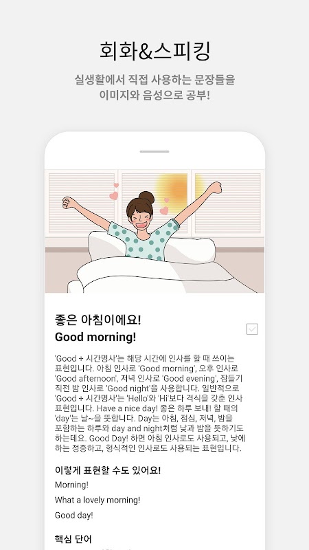 Вы можете эффективно выучить произношение и примеры предложений слов с помощью экспертных голосовых объяснений, и вы можете проверять слова на экране ожидания вашего телефона, а также с помощью повторного прослушивания.