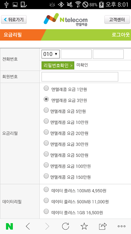 1) 리필서비스 : 신용카드, 가상계좌를 이용한 선불요금 구매/리필