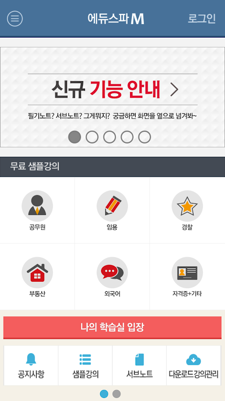 이 외에도 최근 강의 목록 중 가장 최근 시청했던 강의를 즉시 시청할 수 있는 이어보기 기능, 월간/주간 달력에 일정 추가 및 학습목표 등록이 가능한 맞춤스케쥴 관리, 남부고시(공무원), 박문각중개사(공인중개사), 박문각임용(임용고시), 남부경찰(경찰채용), 굿패스(금융전문교육) 최신강의를 경험할수 있는 샘플강의가 서비스 됩니다.