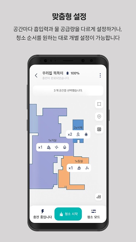 Вы можете установить различную мощность всасывания и подачу воды для каждого помещения или установить индивидуальные настройки, такие как повторная уборка и порядок уборки по желанию.