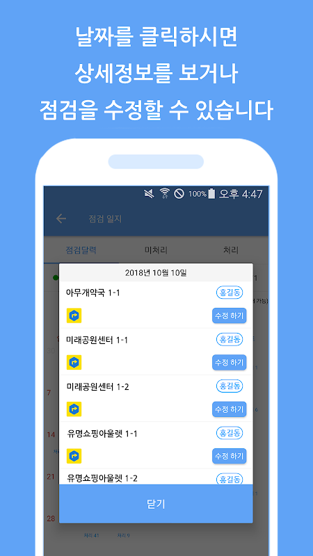 로그인후 간단한 터치로 승강기 정보센터에 점검을 전송해줍니다.