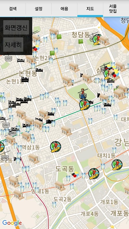 지도위에 임의의 위치을 클릭하고, '화면갱신' 버튼을 눌러도 다양한 취향에 맞는 장소를 찾아준다.