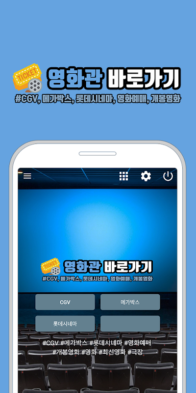 Ярлык кинотеатра предоставляет информацию о различных кинотеатрах, таких как CGV, Megabox и Lotte Cinema, в одном приложении.