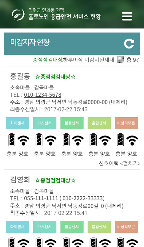 세대에 설치된 센서에서 하루 이상 아무런 데이터가 수신되지 않을때 미수신자로 뜨고 해당하는 노인의 이상여무 확인하도록 서비스 하는 기능이다.