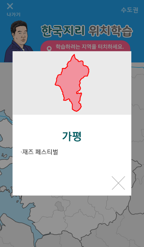 - 권역별로 자신이 취약한 부분을 선택하여 학습할 수 있으며, 한국지리 백지도에서 특정 위치-지역을 클릭하면 해당 위치와 지역의 주요 특징을 확인할 수 있습니다.
