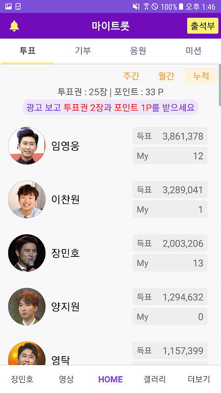 출석체크 - 투표권 적립