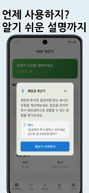 Приложение с финансовым калькулятором на корейском языке, разработанное специально для пожилых людей, чтобы помочь им спланировать досрочный выход на пенсию и выход на пенсию.
