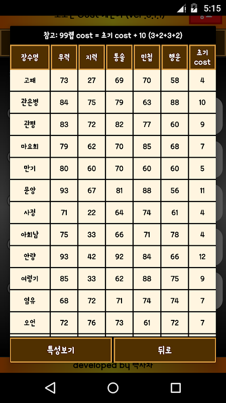 2. 장수 정보 (스탯, 특성 등)을 볼 수 있습니다.