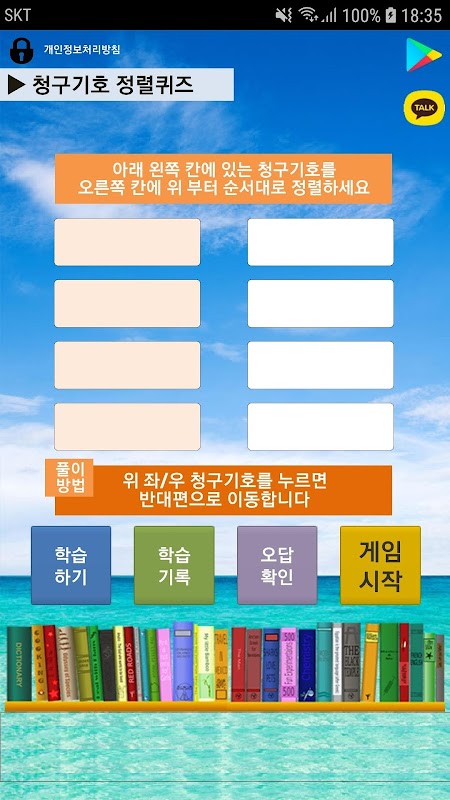 청구기호 정렬퀴즈는 퀴즈풀기와 오답확인, 학습기능을 통하여 도서관에서 책을 정리하는 순서를 쉽게 익힐수 있게 도와줍니다.