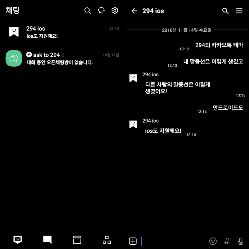 Черная тема KakaoTalk с резкой, но аккуратной черной темой, которая даже не имеет речевого пузыря.