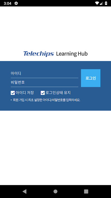 PC환경의 텔레칩스 러닝허브(http://telechips.hunet.co.kr)의 아이디와 비밀번호로 로그인 가능하며, 주요 서비스를 본 모바일 앱에서도 사용하실 수 있습니다.