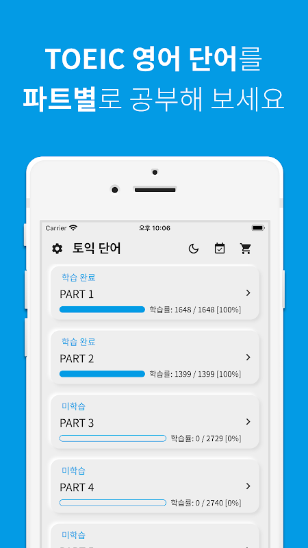 - Вы можете установить или сбросить ход изучения английских слов TOEIC, нажав и удерживая часть или единицу.