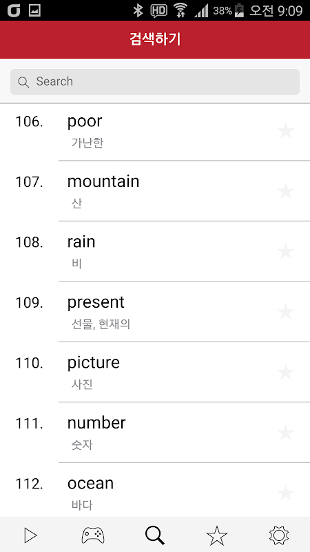 - 단어를 계속 봐도 모르겠으면 위에 별모양 아이콘을 클릭하면 "암기장"으로 넘어 갑니다. 하단메뉴에 별모양의 "암기장"에서 모르는 단어를 계속 반복해서 공부 할 수 있습니다.
