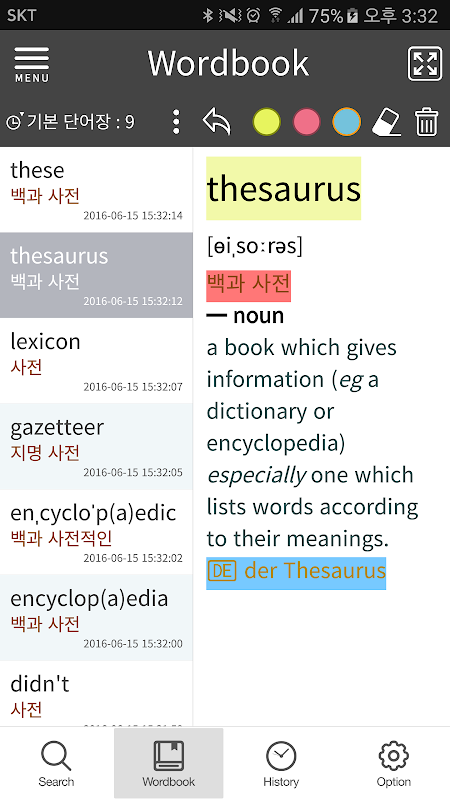 ※ 본 사전 어플은 한영을 기준으로 보통 영어로 검색되며, 한글은 표제어가 있을 경우 검색됩니다. 한영 검색 결과를 독일어로 보여주며 별도의 독일어 입력은 불가함을 알려드립니다.