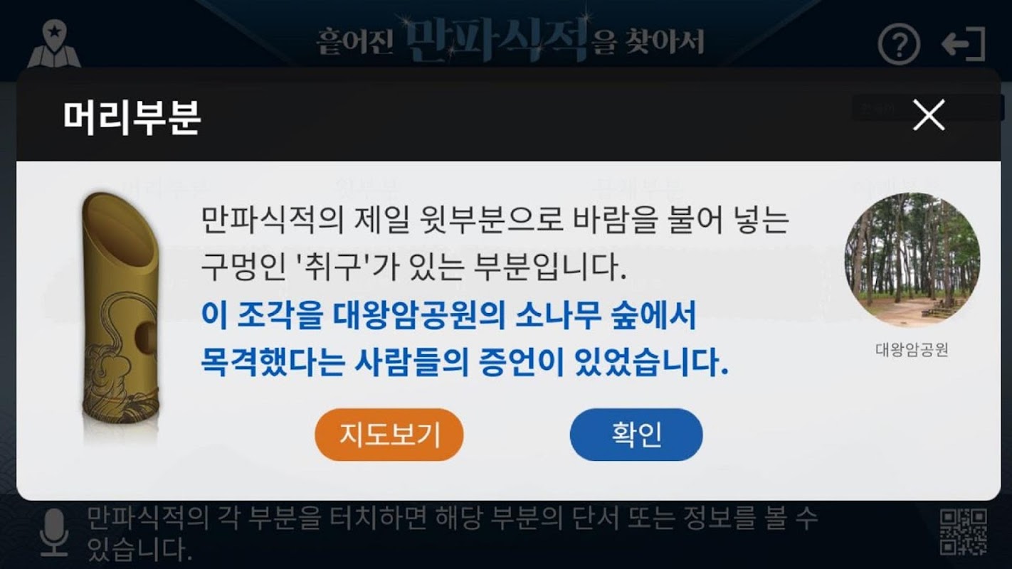 메인화면의 QR코드 버튼을 통해 정보를 수집하고 문제를 해결하여 만파식적의 조각을 획득하세요.
