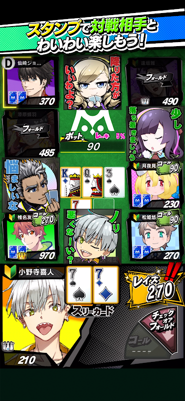 ・m HOLD’EMでは、既存に存在するテキサスホールデムのゲームアプリのイメージを払拭するスタイリッシュなデザインと、有名イラストレーターがデザイン&有名声優が演じる個性豊かなアバター達と共にゲームを楽しむことができます。また、ゲーム中に状況に応じたキャラクターごとに用意されているスタンプを使って、プレイヤー同士の交流を取りながらテキサスホールデムを堪能できます