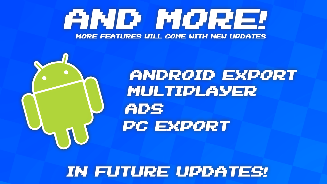 Одно касание, и твоя игра уже доступна каждому! Твоим будущим игрокам даже не придётся грузить Game Creator Studio ™! В ближайшем обновлении планируются функция экспорта игр на любые платформы без использования конструктора.