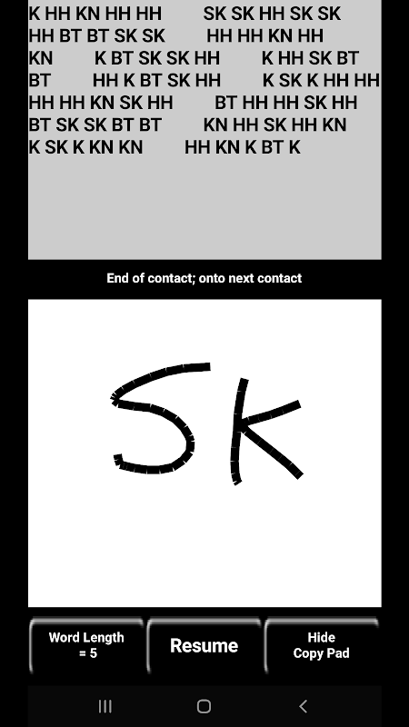 Используя панель копирования, вы можете получить строку символов азбуки Морзе и написать в пробелах пальцем или стилусом. После представления строки приложение ненадолго приостанавливается, чтобы вы могли самостоятельно проверить свою точность. Затем пробелы автоматически удаляются и воспроизводится новая строка символов. Вы можете изменить длину слова от 1 до 10 символов. Copy Pad НЕ пытается распознать ваш почерк. Если используется внешняя клавиатура, приложение сравнит выбранную строку с введенной вами, отображая неправильные символы красным, а правильно набранные — черным.