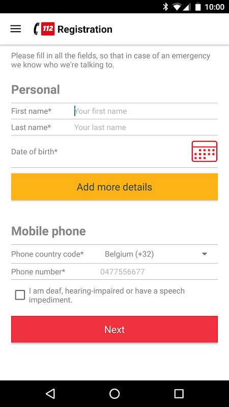 Приложение 112 Бельгия является официальным приложением для служб экстренной помощи Бельгии. После того, как вы зарегистрируетесь в приложении, вы можете сделать через него экстренный вызов скорой помощи, пожарной охраны или полиции. Если вы используете приложение, центры экстренной помощи автоматически получают информацию о вашем местонахождении и о том, кто вы. Эта информация обычно передается через Интернет, однако, когда подключение к Интернету недоступно, для передачи этой информации в службы экстренной помощи используются SMS (адресат SMS, используемый для этого, является бесплатным). Когда вы не можете общаться с помощью речи, оператор в исключительных случаях может также активировать функцию чата. Для получения дополнительной информации посетите https://112.be/