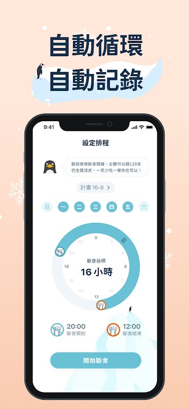 Oписание 168斷食鬧鐘:企鵝斷食、追蹤計時器、間接性斷食、減肥神器