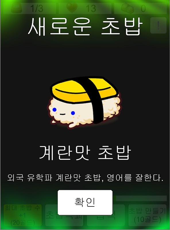 같은 초밥 두개를 합쳐 새로운 초밥을 만들어가자! 만들 수록 더 귀한 초밥이 나타난다! 초밥대백과를 채우자!
