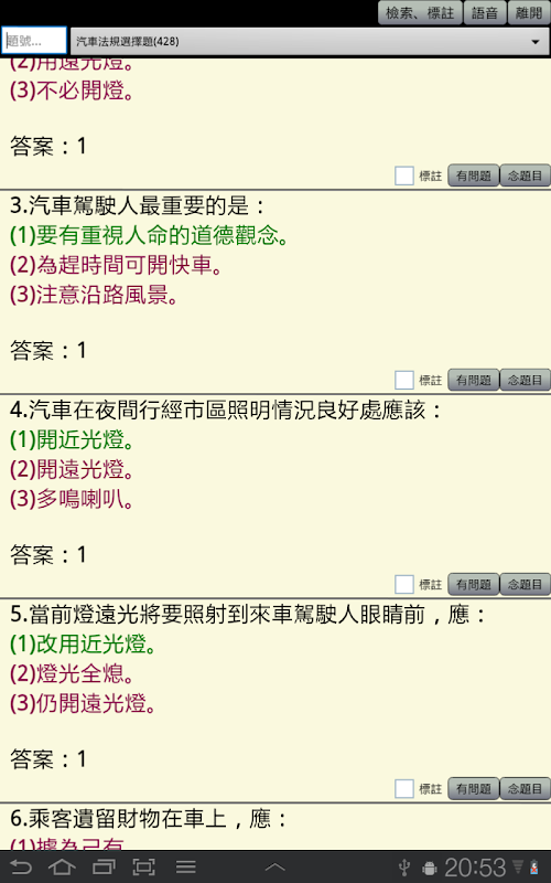*Новая функция: [Классификация]. Ненормативные вопросы и вопросы с несколькими вариантами ответов разделены на 7 категорий в зависимости от типа вопроса. Метод классификации точно такой же, как метод классификации типов вопросов Управления шоссейных дорог Министерства транспорта. Просто нажмите «Классификация» в верхнем левом углу списка банка вопросов. Вы также можете прочитать только банк вопросов «Категория». (Классификация сигналов и механических знаний не предусмотрена). (Спасибо за предложение)