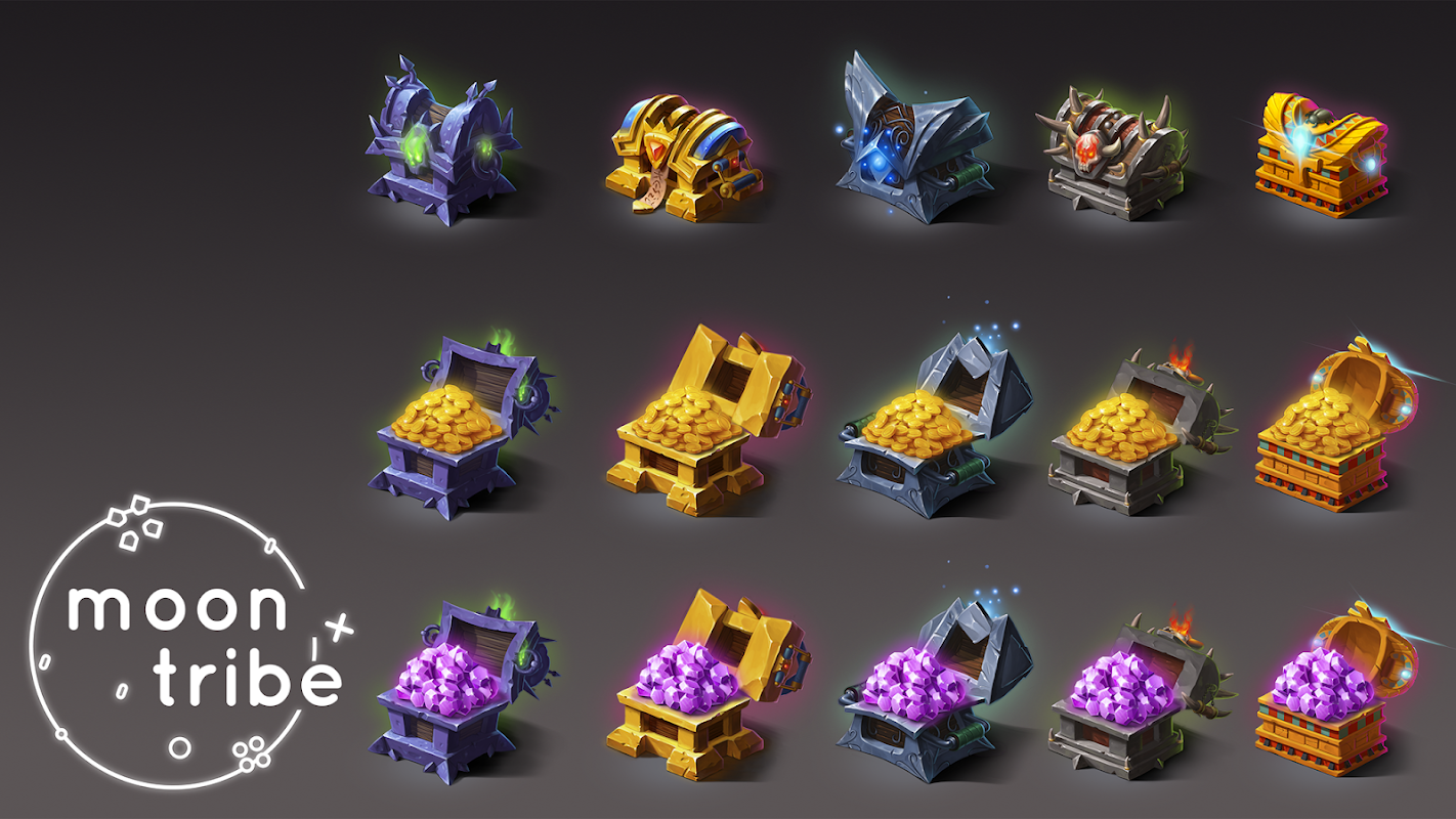 Hand-painted set of fantasy-themed 2D chests. AAA quality. High resolution. Demo scenes and previews. Everything set and ready for use.