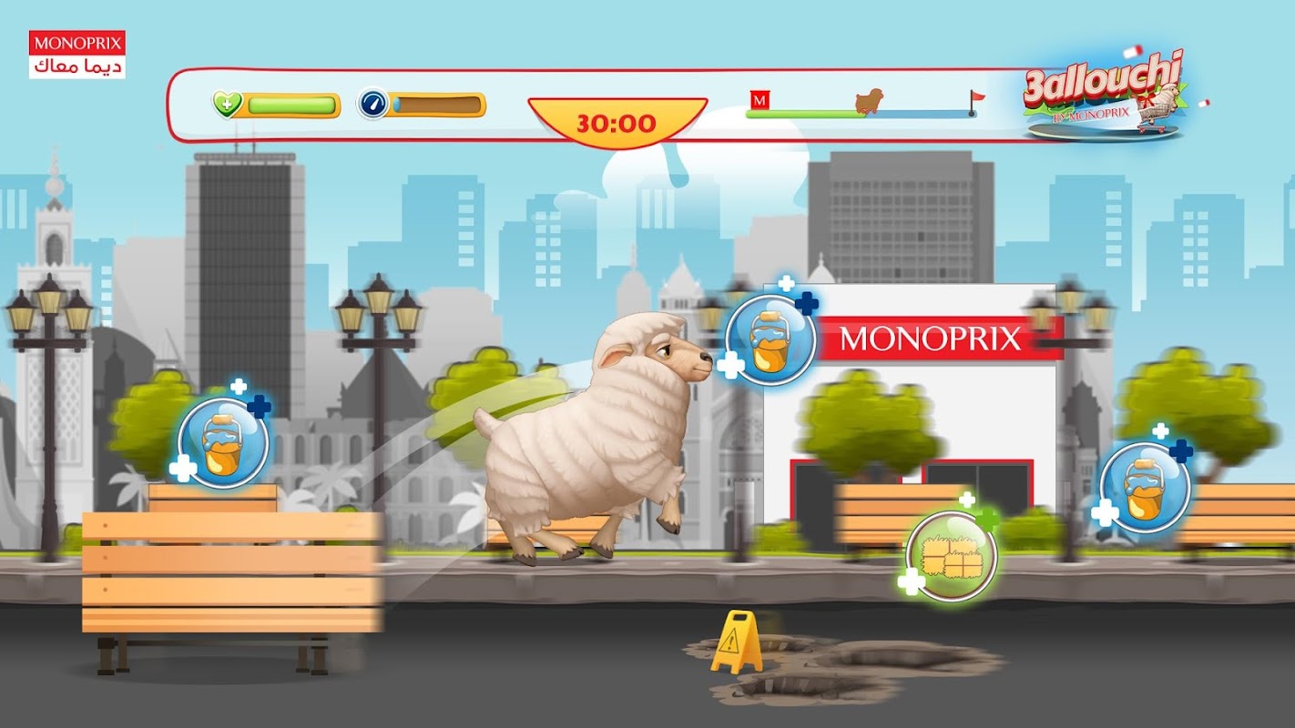 Vous avez maximum 2 minutes pour emmener votre 3allouche du Monoprix à la maison, faites attention aux obstacles et n’oubliez pas de boire et de manger (Bonus Foins et Bonus eau) sinon votre 3allouche s’arrêtera en cours de route.